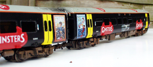The DMUs (158819/821/825/827/841) received a black and yellow vinyl livery containing two large body-side 'Ginsters' logos and one small logo, and a Cornish beach-scene, together with a different 'hand-painted' style advertising poster on each side close to the corridor connections, and even Ginsters logos on the roof!