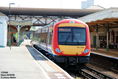 One of the SWT 450s rolls into Hove station with a Basingstoke - Brighton service. These are lovely trains, although the nice ambience is spoilt by the ear-piercing door opening alarm.