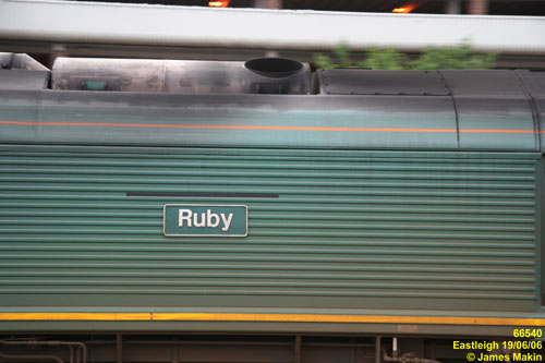 Meanwhile below, one can clearly see the mark on the bodyside above the nameplate (velcro for the curtain?), presumably left by 66540's relatively recent naming ceremony.