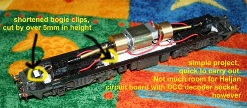 After this, measure the bottom of the Heljan bogie towers and cut out the appropriate size of plastic from the Hornby bogie mouldings, allowing a nice fit with the Heljan towers. The Hornby metal weight was removed to be replaced with liquid lead, leaving plenty of space to fit the motor.